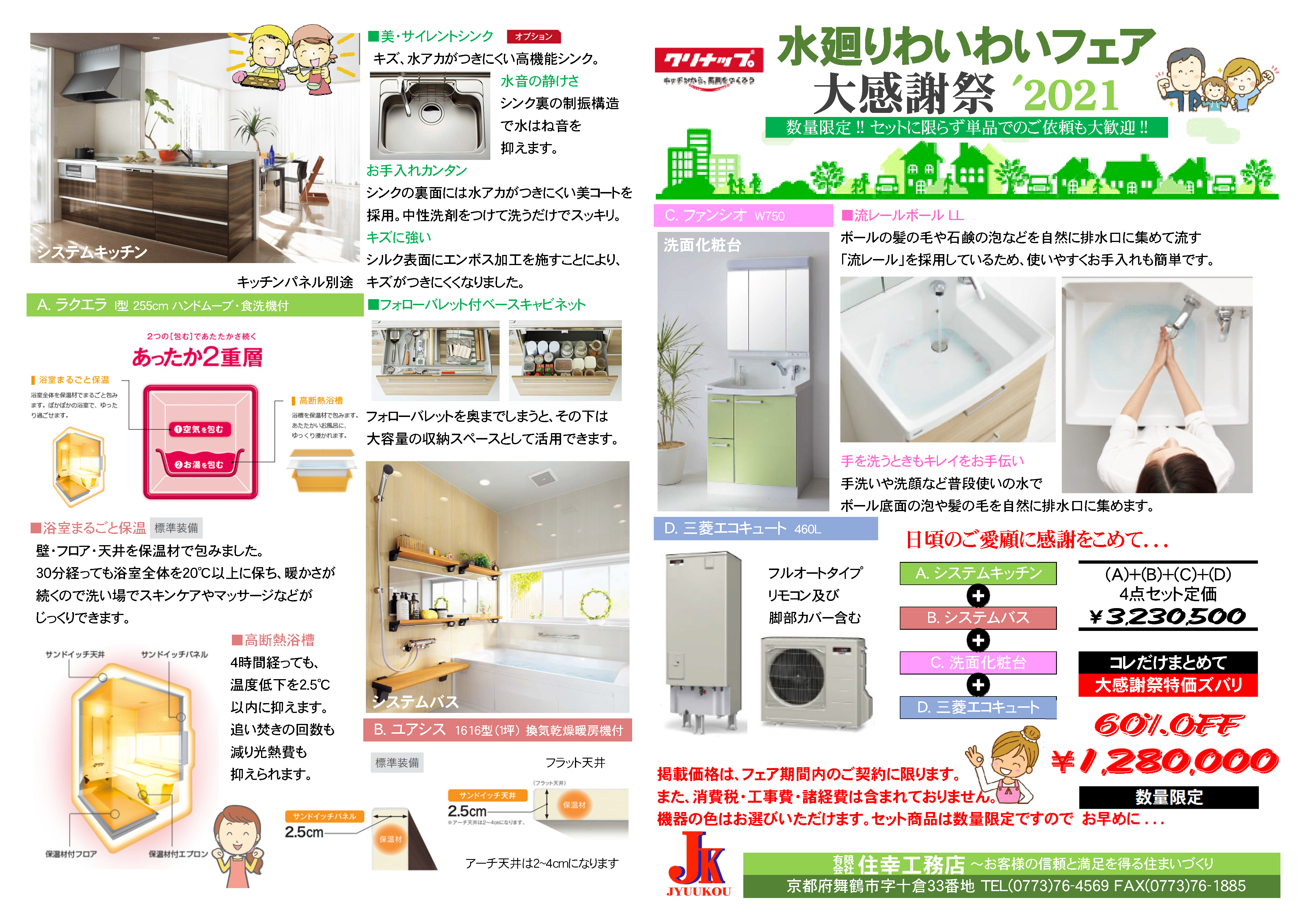 日頃のご愛顧に感謝をこめて水廻りリフォームの大感謝祭を開催いたします。 様々な特典をご用意しております。この機会に水廻りリフォームをご検討下さい。
